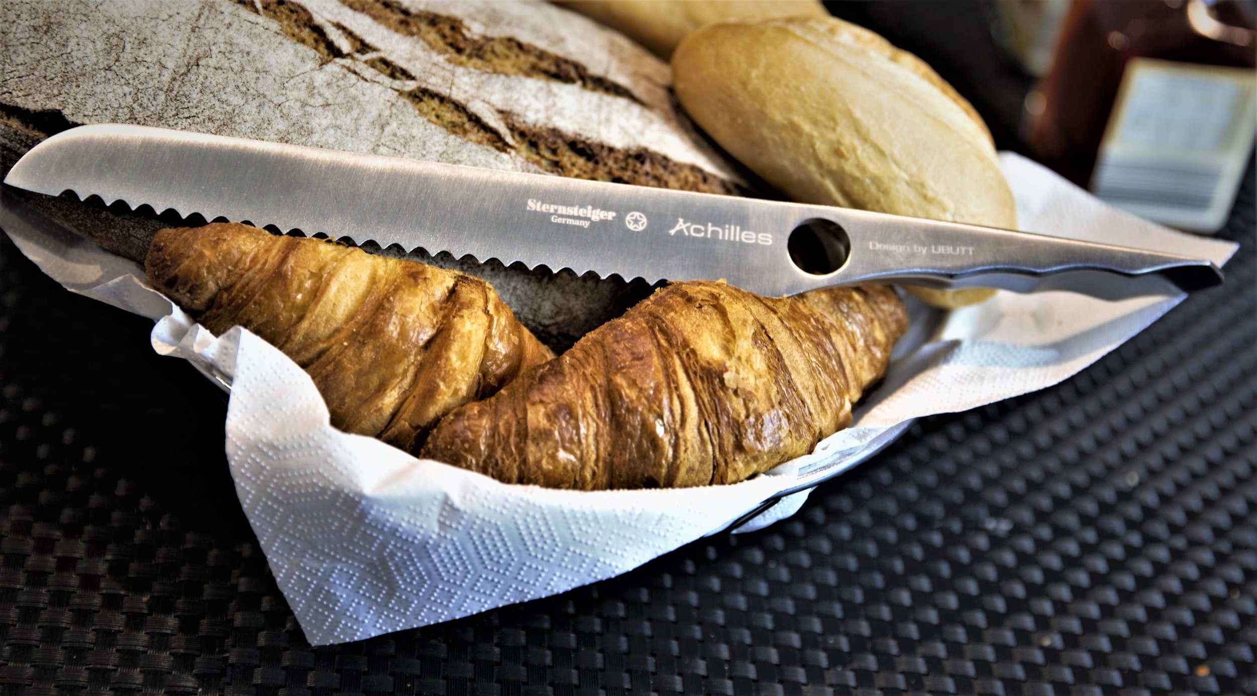Das Achilles Brotmesser, entwickelt von Sternsteiger Deutschland in Zusammenarbeit mit UBUTT Designs, ist das Ergebnis intensiver Forschung und Entwicklung, die darauf abzielen, ein Brotmesser zu schaffen, das in jeder Küche unverzichtbar ist. Dieses Brotmesser kombiniert fortschrittliche Technologie mit handwerklicher Exzellenz und bietet eine perfekte Mischung aus Schärfe, Zuverlässigkeit und ergonomischem Design.